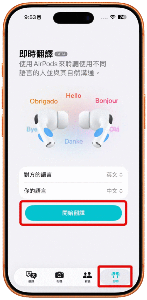 隨後就可以打開內建「翻譯APP」,切換到右下角「即時」選單分頁,設定好要聆聽對方和自己的語言,就可以按下「開始翻譯」。