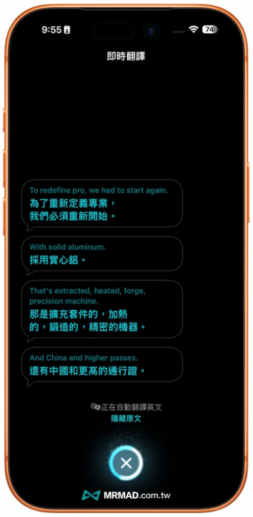 只要是對方沒有戴 AirPods 耳機,iPhone 螢幕內的即時翻譯,同樣會顯示你和對方說出來的文字。