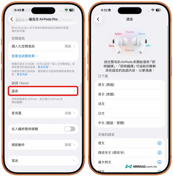 iOS 26.1 正式推出後,能支援AirPods即時翻譯語言包含: